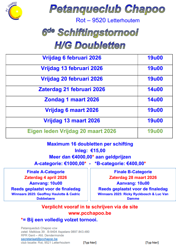 Elke 4de vrijdag van de maand om 20 uur wordt er gespeeld aan de hand van vaste doubletten (inschrijven per 2).