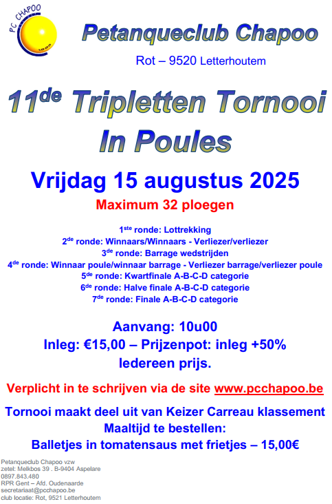 Maaltijd: Balletjes in tomatensaus met frietjes voor 15€ per persoon en te bestellen bij de inschrijving.