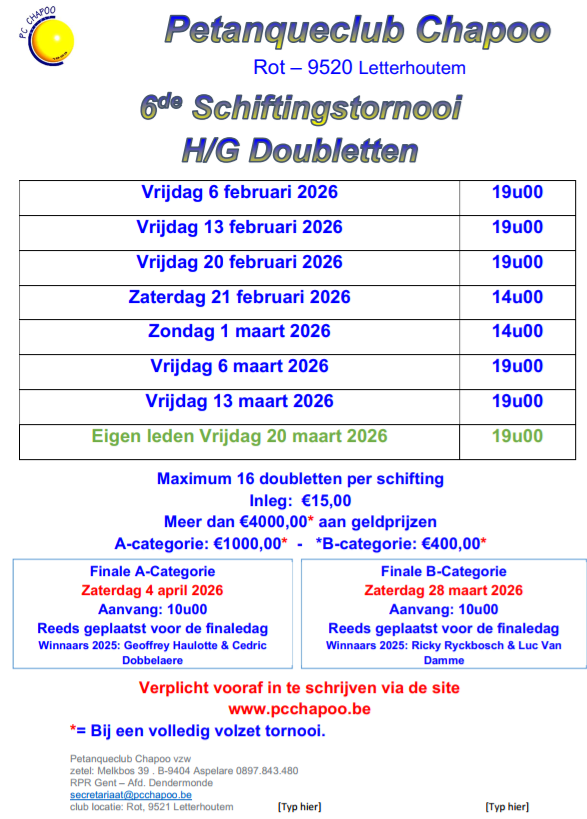 Maximum 16 doubletten per schifting Inleg: €15,00